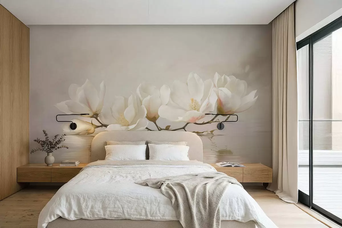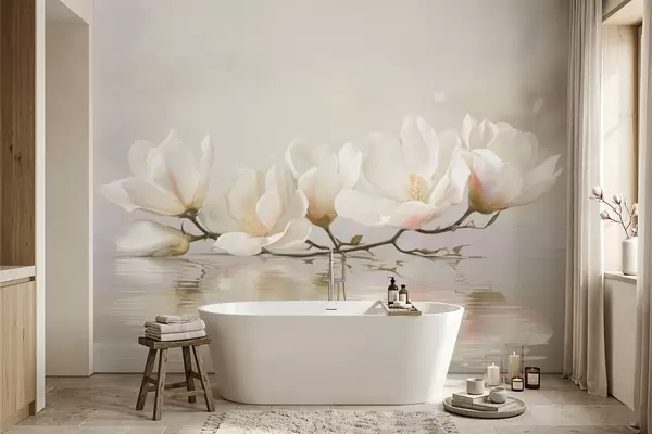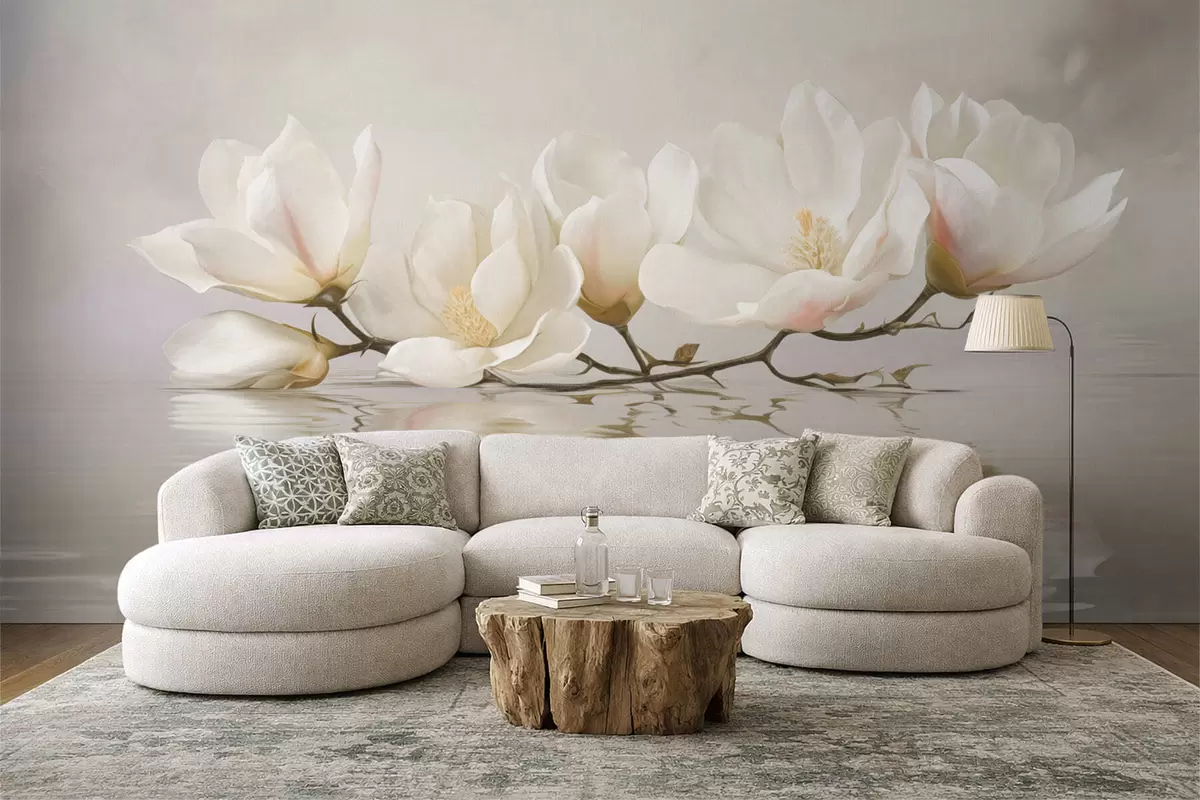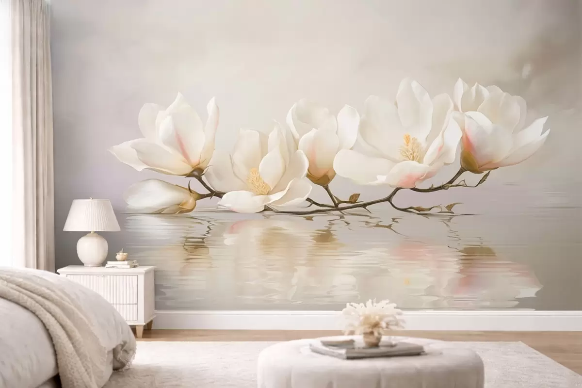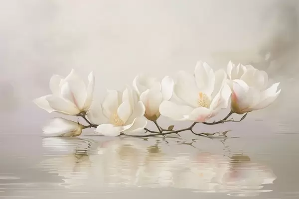 Fototapeten Helle Magnolienblüten auf einem Ast über dem Spiegelbild des Wassers Nr. w05353
