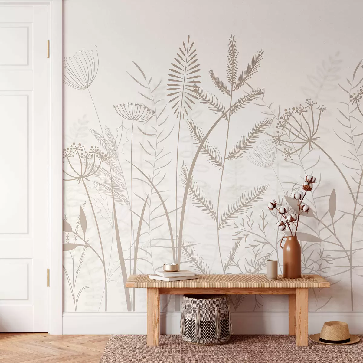 Fototapeten zarte, handgemalte Wildgräser und Blumen vor weißem Hintergrund Nr. w05383v2