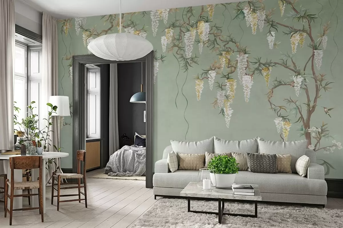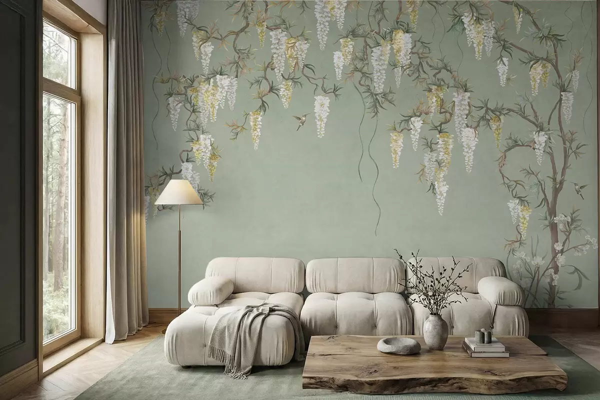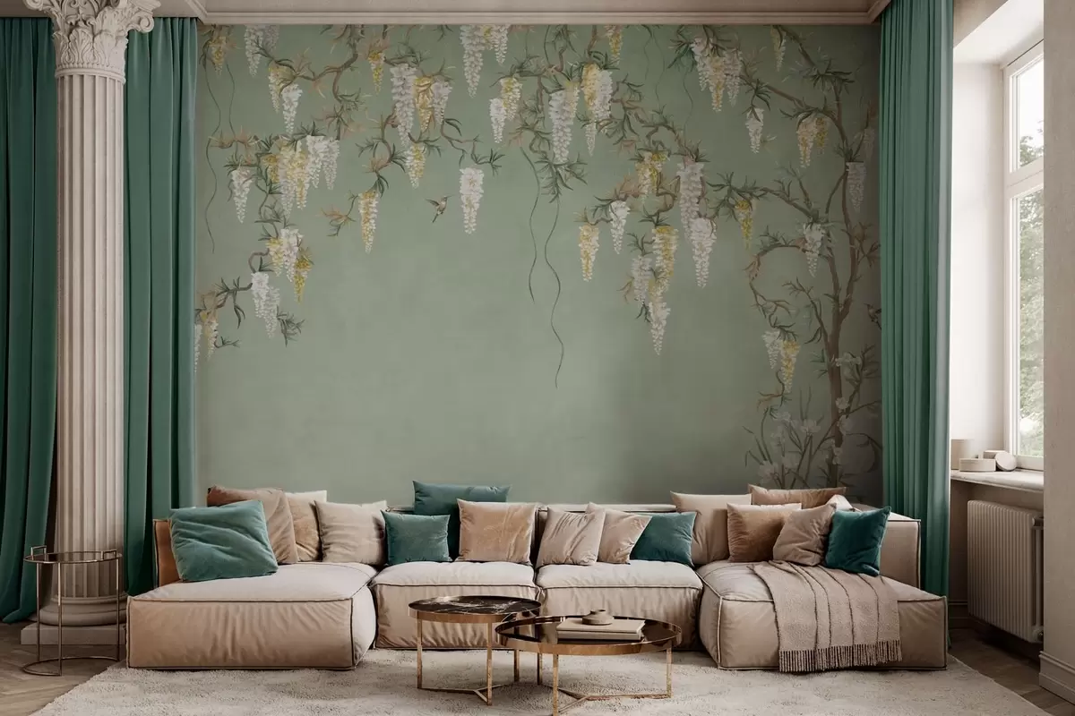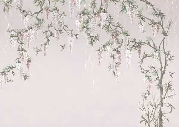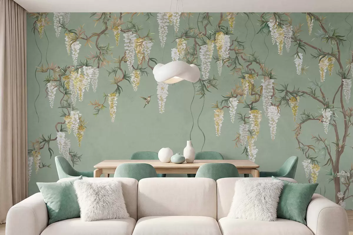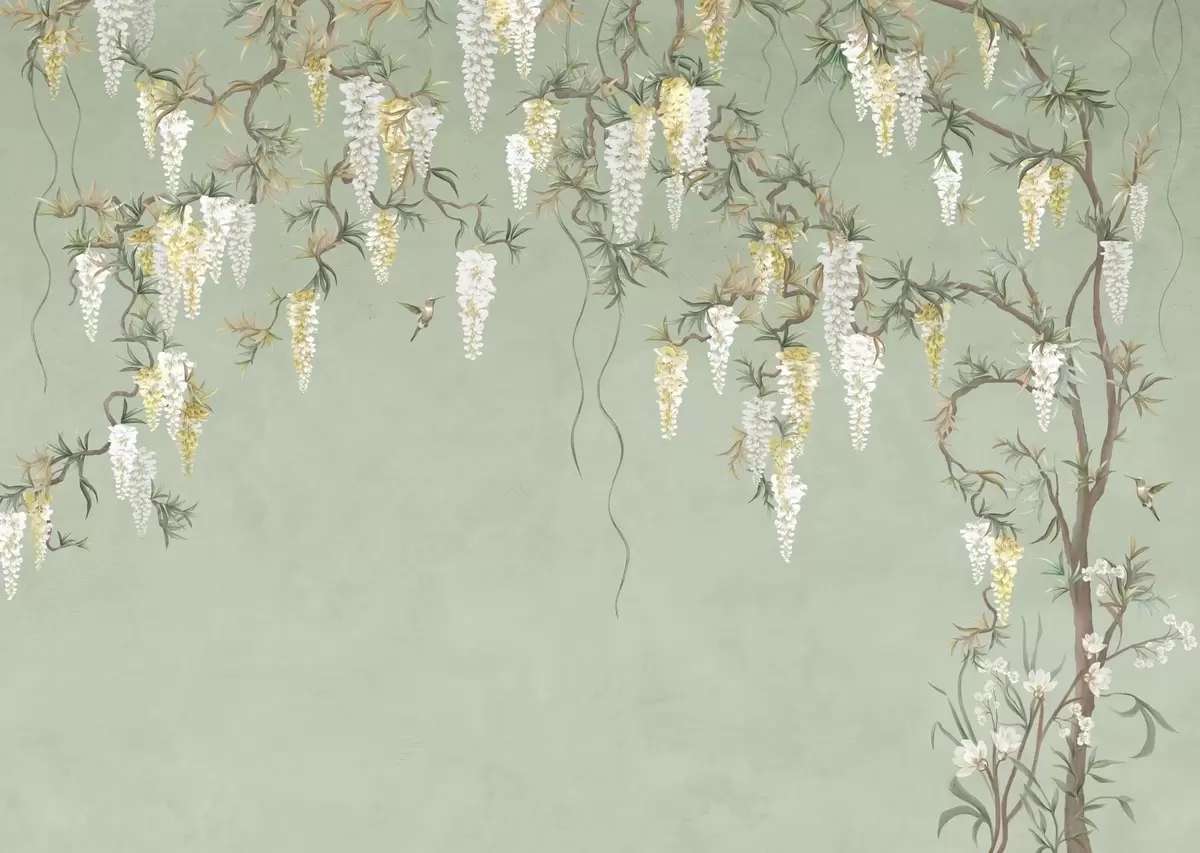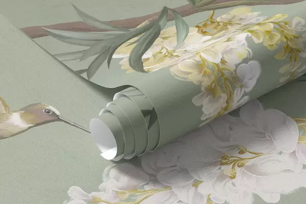 Fototapeten Blühende Zweige mit weißen Blüten und Vögeln auf grünem Hintergrund Nr. w05394