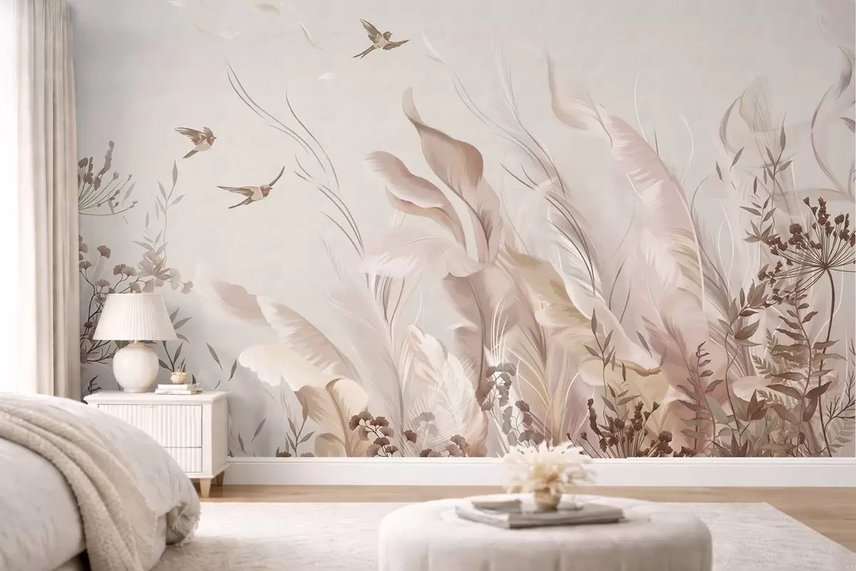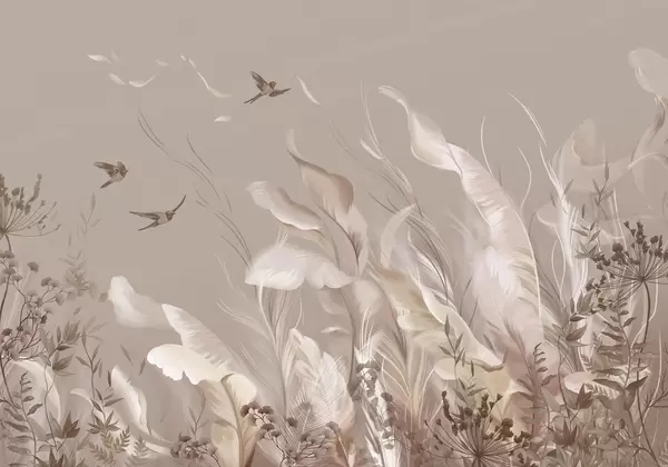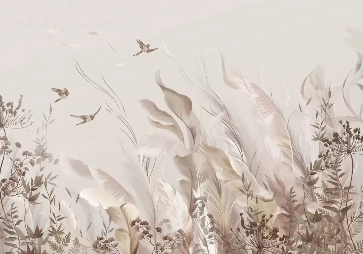 Fototapeten Zarte Federn, Gräser und Vögel in hellen Farbtönen Nr. w05395