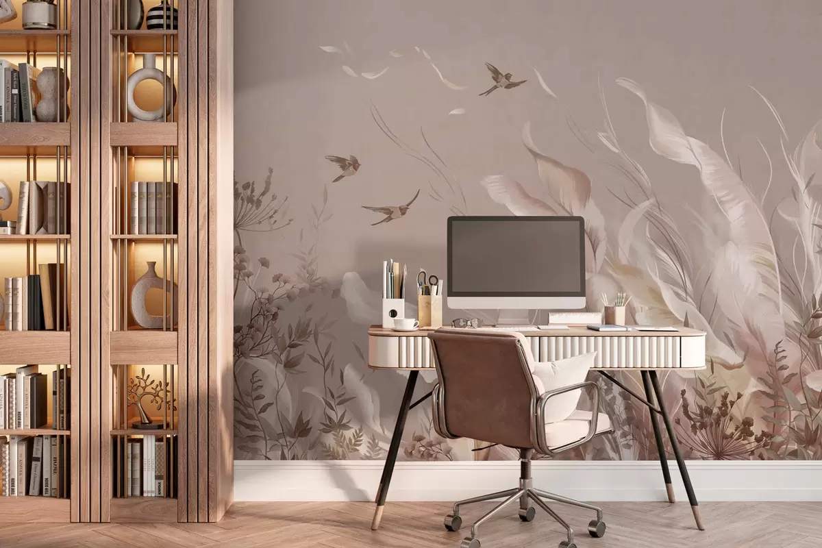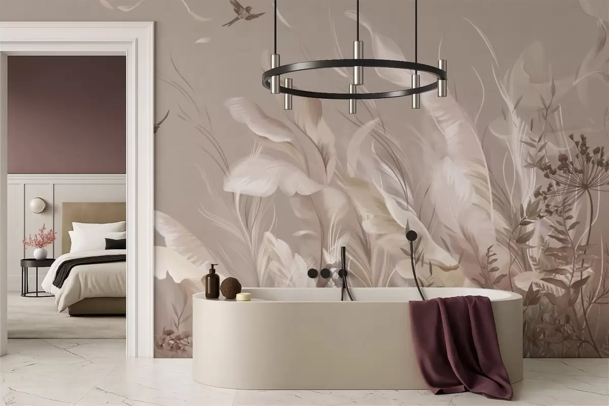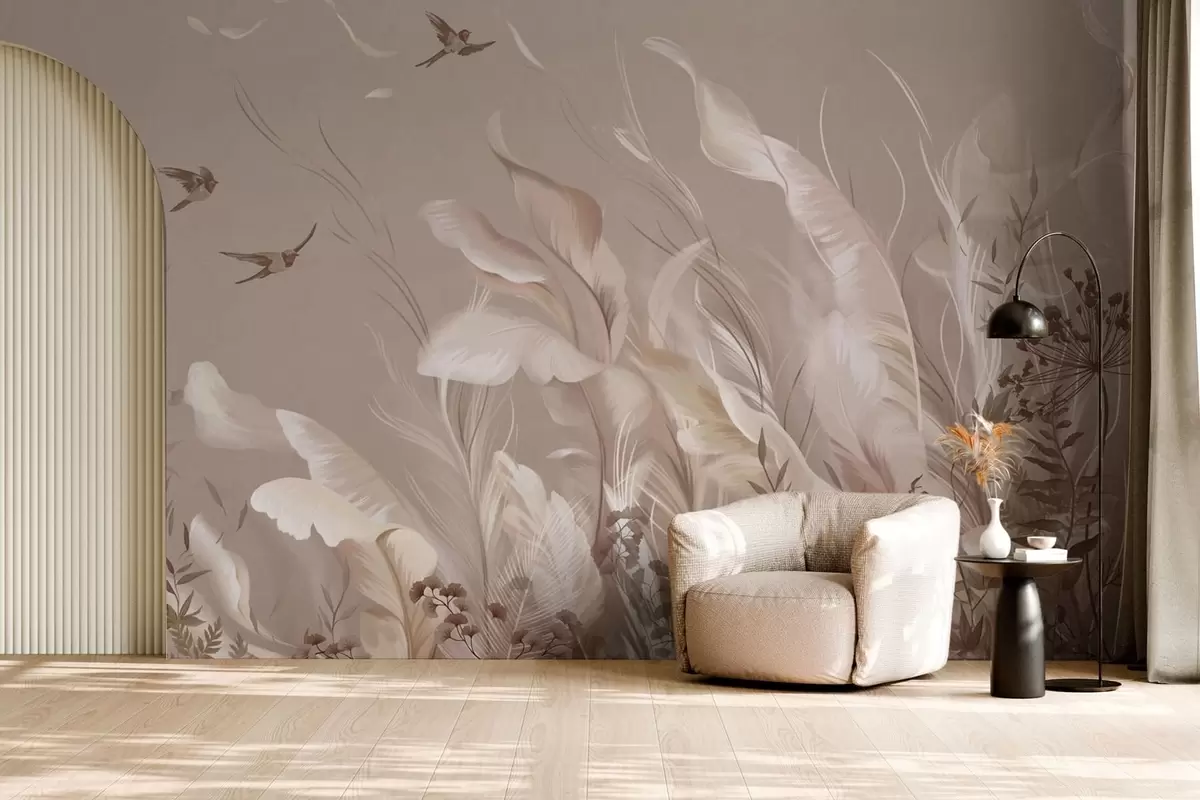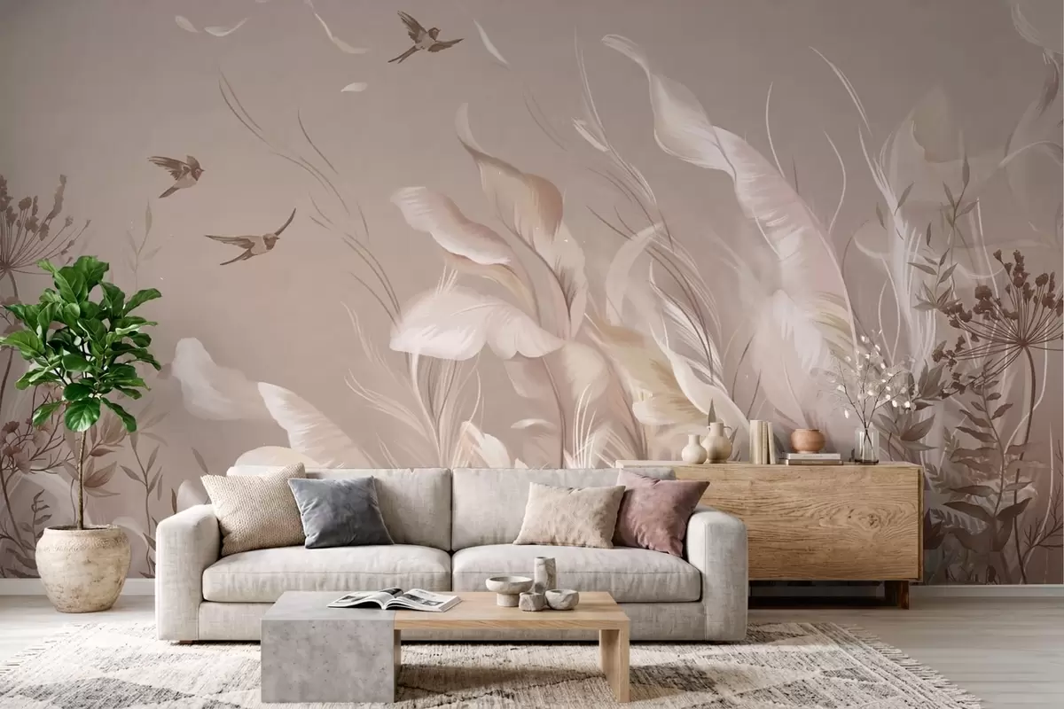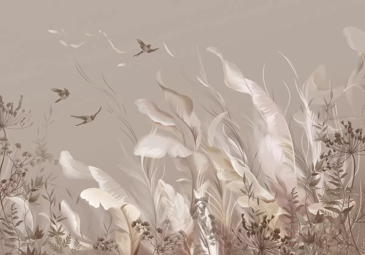 Fototapeten Leichte Federn und Pflanzen mit Vögeln in Pastelltönen Nr. w05395v1
