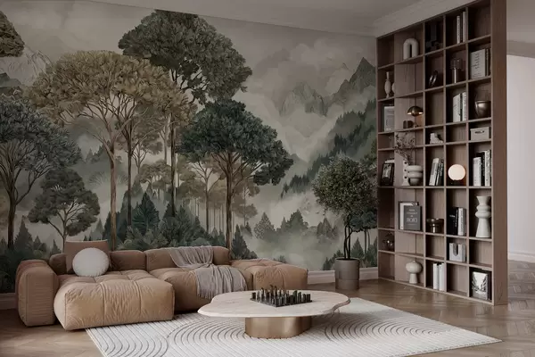Fototapeten Berglandschaft mit Wald in sanften Farbtönen Nr. w05410v1