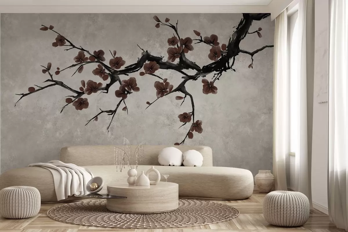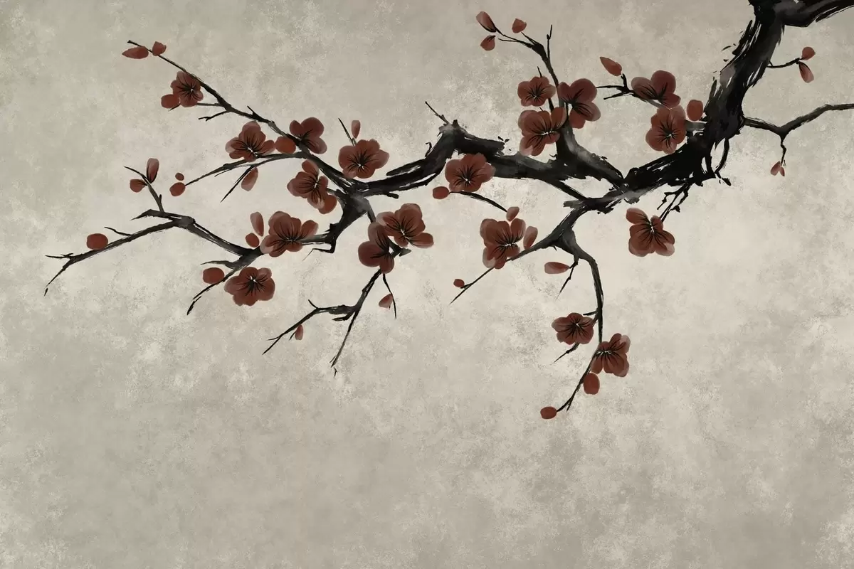 Fototapeten Zweig mit dunkelroten Blüten vor neutralem Hintergrund Nr. w05425v1