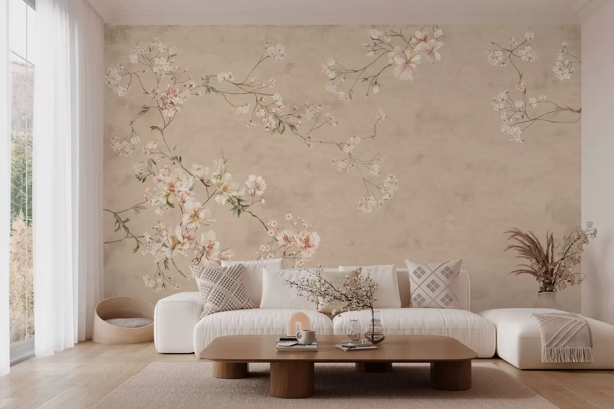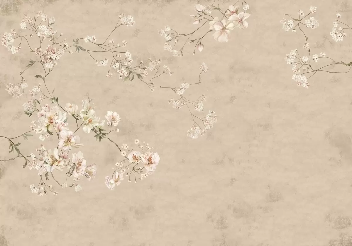 Fototapeten Blütenzweige im Chinoiserie-Stil auf warmem beigem Hintergrund Nr. w05427v2
