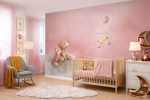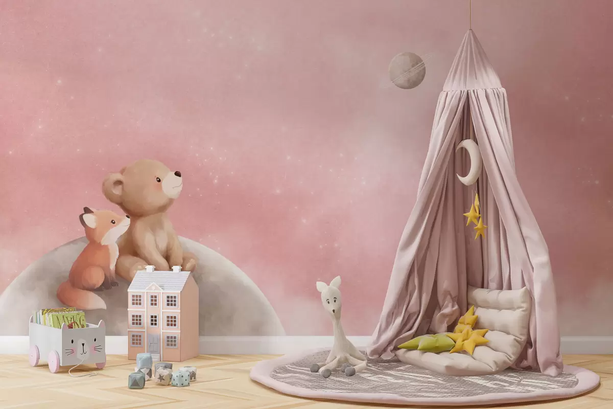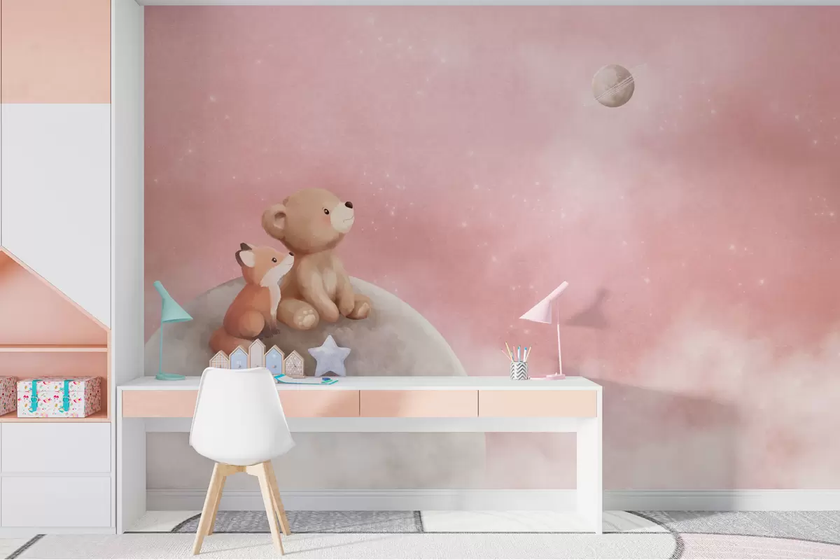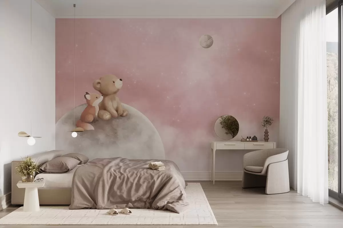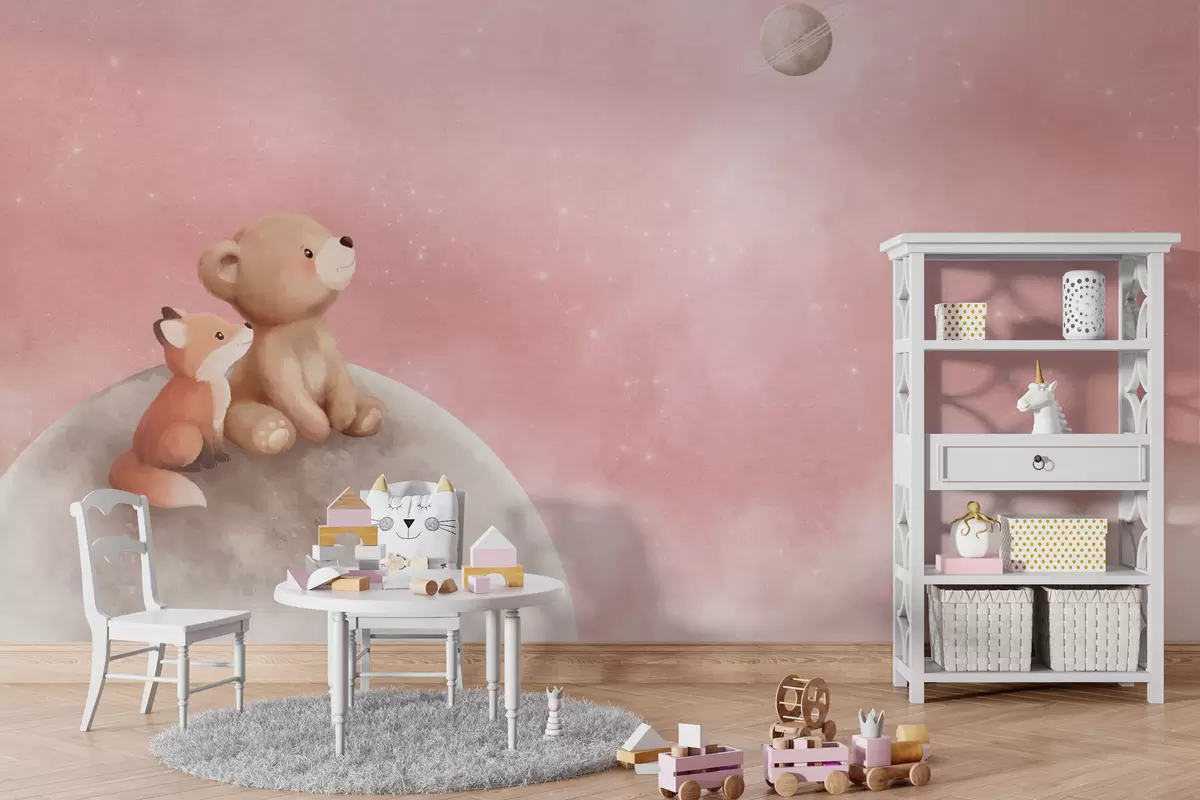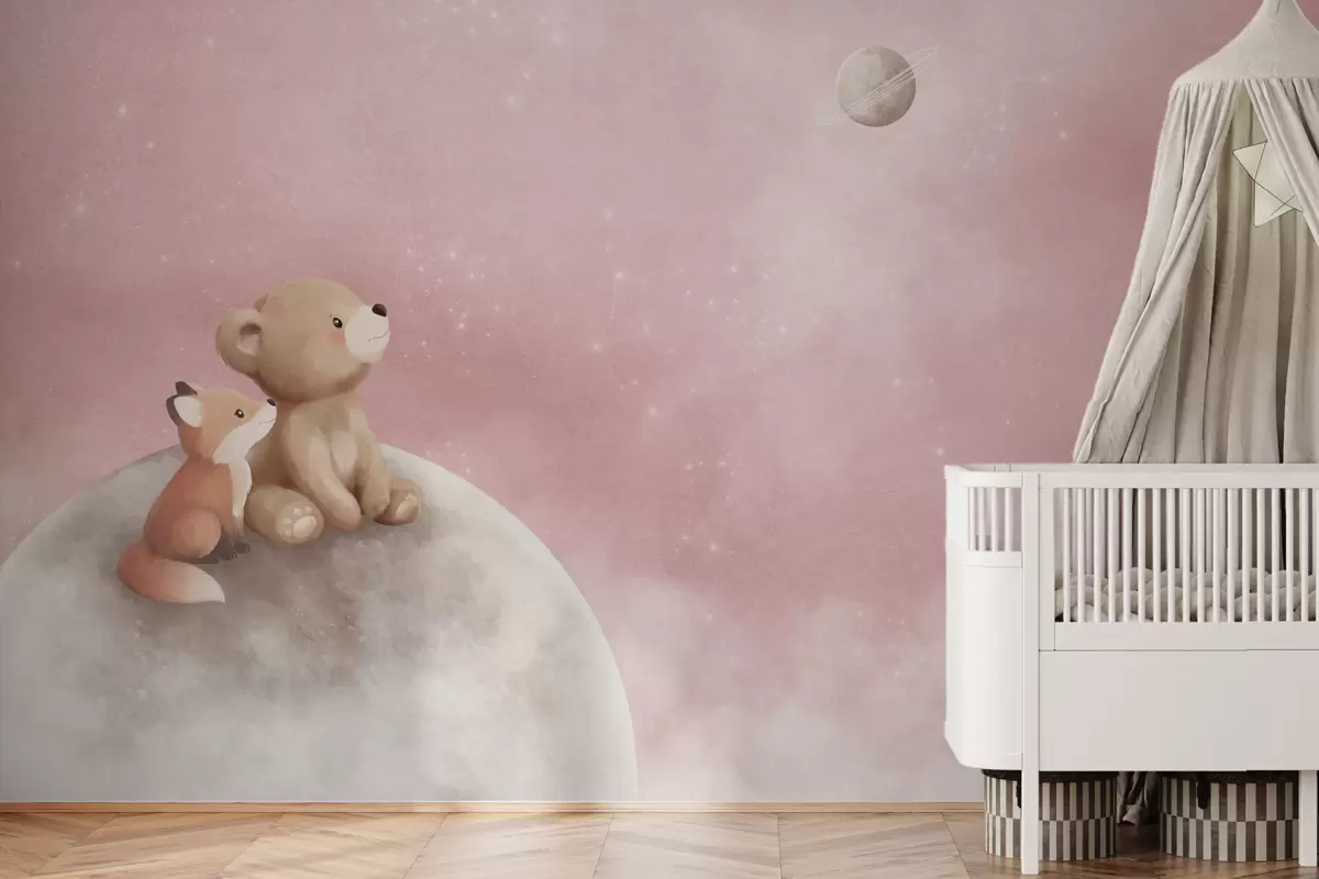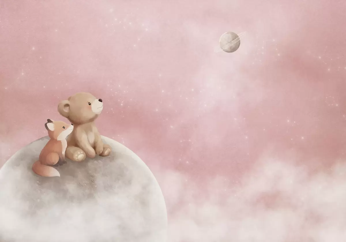Fototapeten Pastellillustration: Bär und Fuchs vor einem rosa Mondhimmel Nr. w05431v2