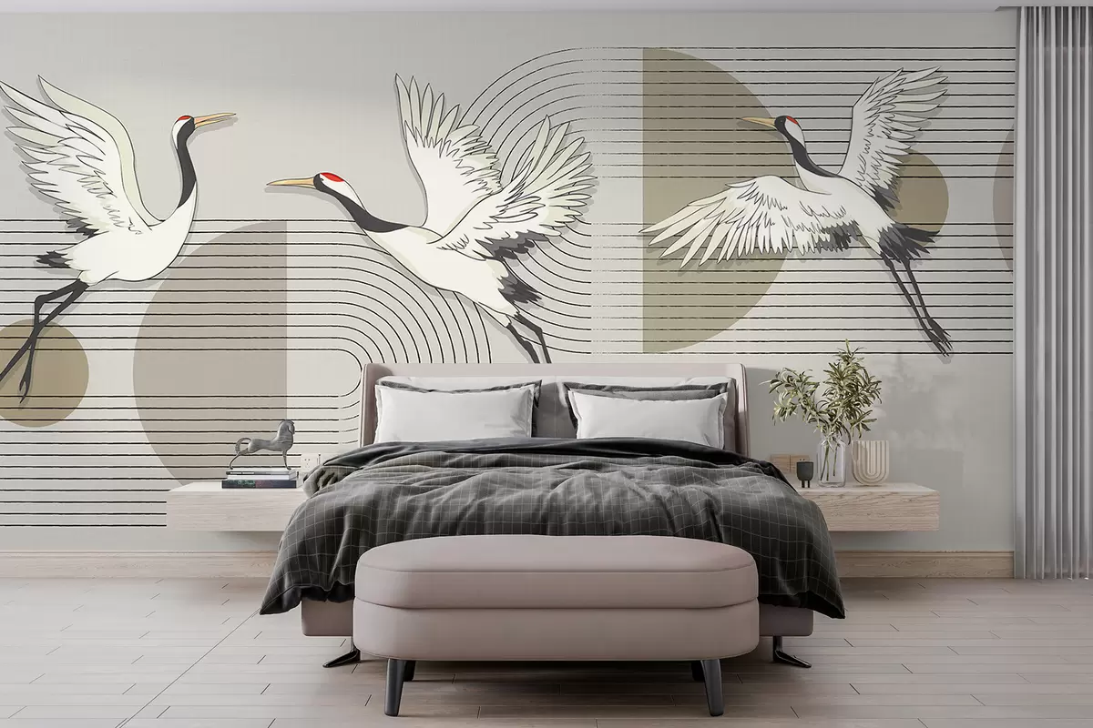 Fototapeten Drei weiße Kraniche im Flug vor einem geometrischen minimalistischen Hintergrund mit konzentrischen Kreisen Nr. w08188