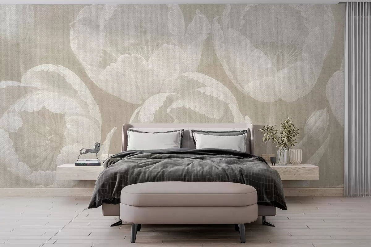 Fototapeten Zeichnung von weißen Tulpen mit weichem, strukturiertem rosa unscharfem Hintergrund auf Leinwand, minimalistischer monochromer Druck Nr. w08193v1