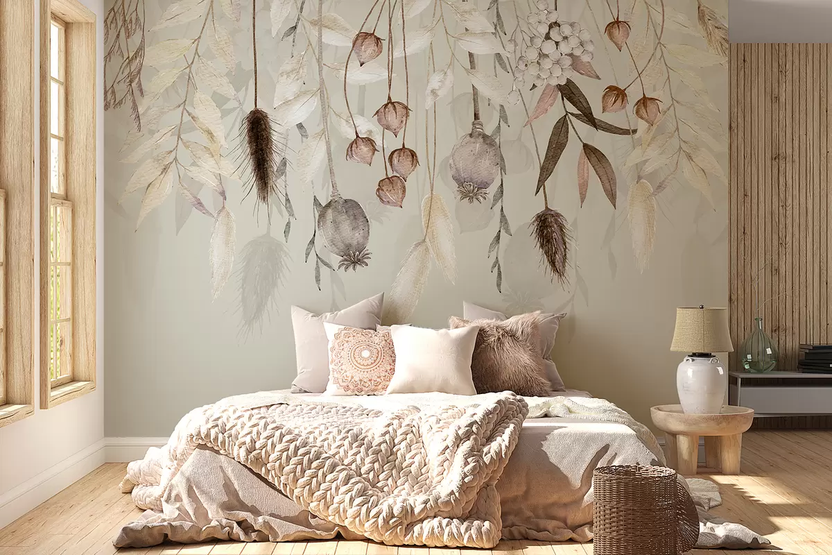 Fototapete Zartes Blumenarrangement mit getrockneten Blumen, Blättern und Federn, die vor einem weichen Hintergrund hängen w08230
