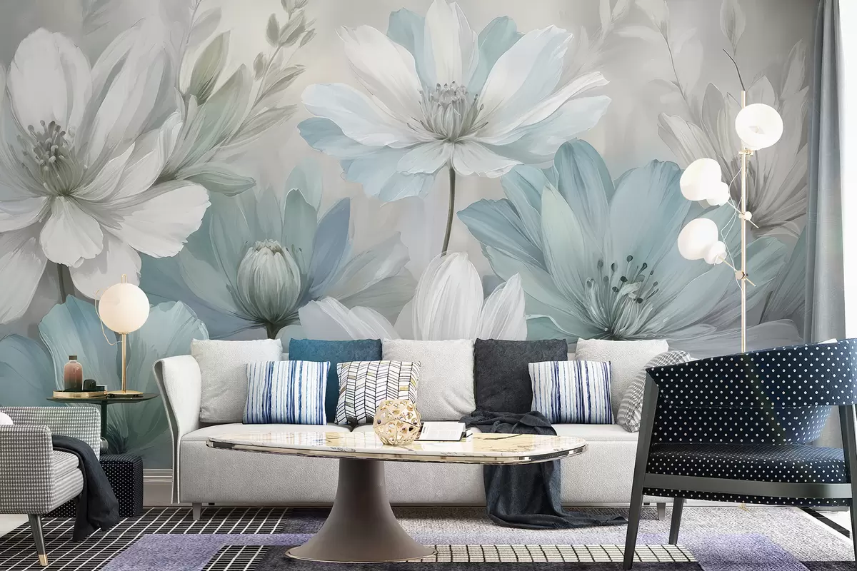 Fototapeten Eine Nahaufnahme von weißen und hellblauen, gänseblümchenartigen Blumen, die Kunst mit weichem, unscharfem Hintergrund malen Nr. w08247