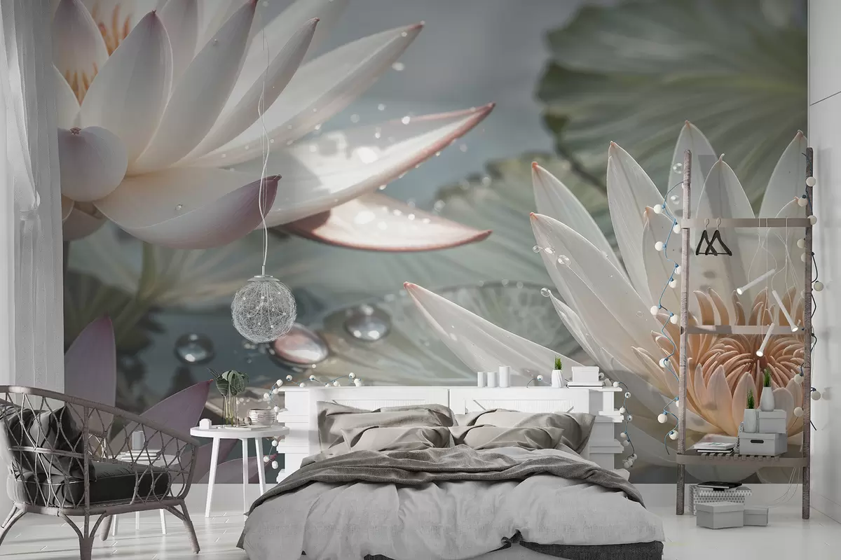 Fototapeten Eine Nahaufnahme von weißen Lotusblumen mit Wassertropfen auf ihren Blütenblättern vor einem unscharfen grünen Hintergrund Nr. w08252
