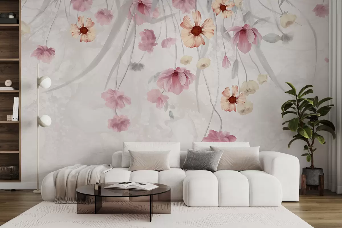 Fototapete Zarte pastellrosa und gelbe Blumen mit gelben Zentren, die über einen weichen, unscharfen Hintergrund kaskadieren w08261v1