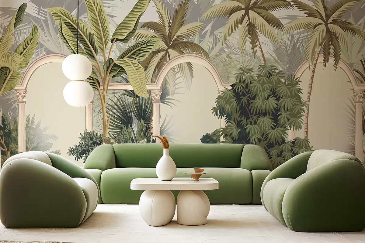 Fototapeten Gewölbe mit tropischer Landschaft, üppigen Palmen und anderem Laub vor hellem Hintergrund Nr. w08306