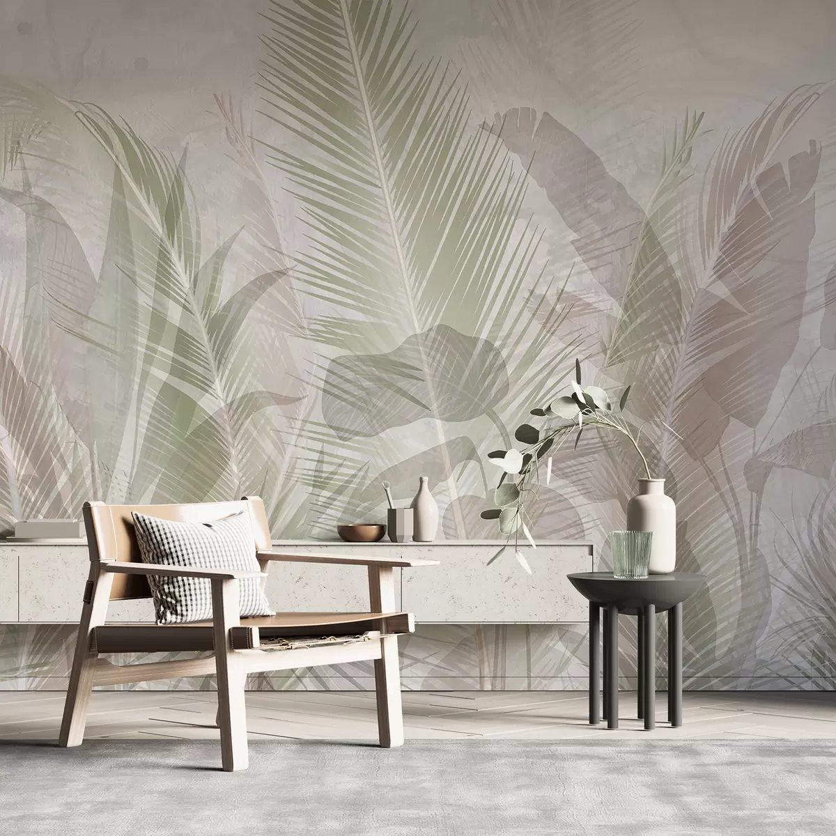 Fototapeten Tropische Palmenblätter in sanften Pastellfarben, mit einem unscharfen und dunstigen strukturierten Hintergrund Nr. w08326