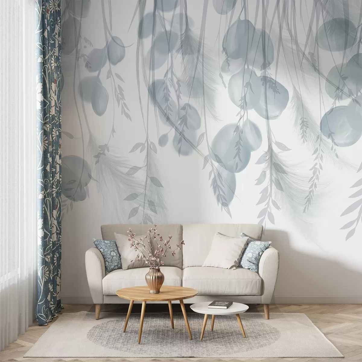 Fototapeten Zarte graue und pastellgrüne Eukalyptusblätter fallen und schaffen eine heitere und beruhigende Atmosphäre Nr. w08380