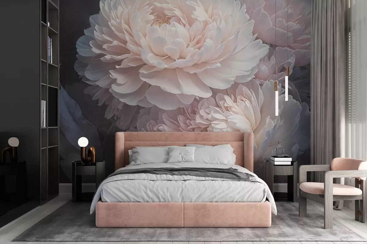 Fototapeten Eine Nahaufnahme von zwei großen, zartrosa Pfingstrosen mit weichen, flauschigen Blütenblättern und Blättern vor einem unscharfen Hintergrund Nr. w08382