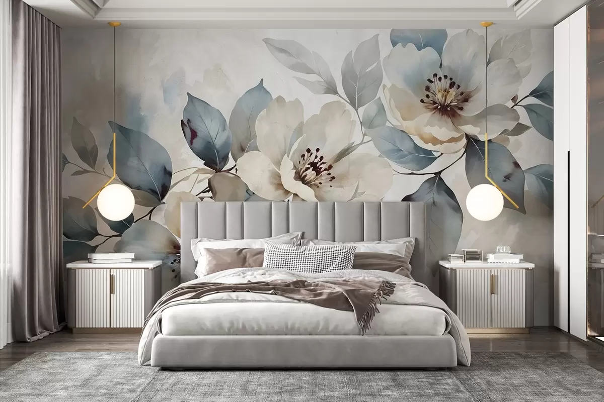 Fototapeten Zartes Blumenarrangement mit Aquarellstruktur in Weiß und Blau, mit weichen Blütenblättern und -mitten Nr. w08401