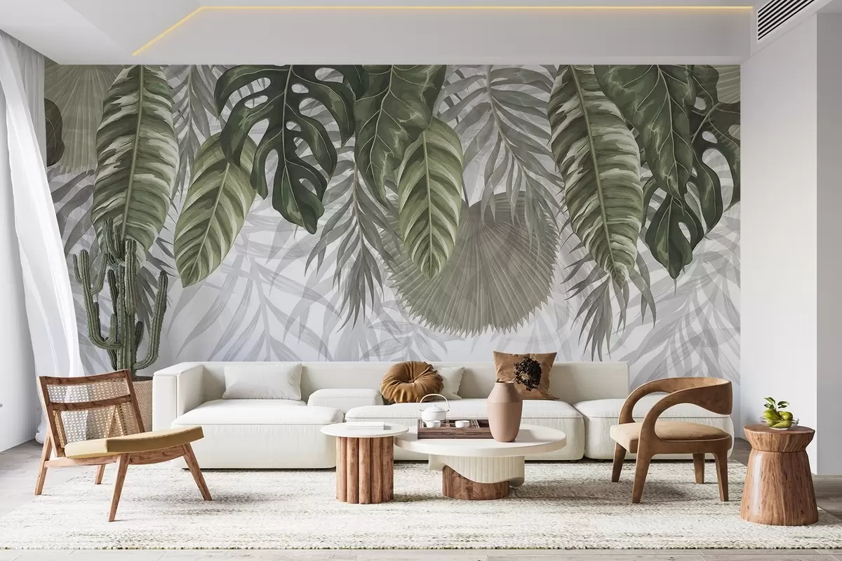 Fototapete Tropische Blätter in Grüntönen, darunter große Monstera-Blätter und Palmwedel auf weißem Hintergrund w08443