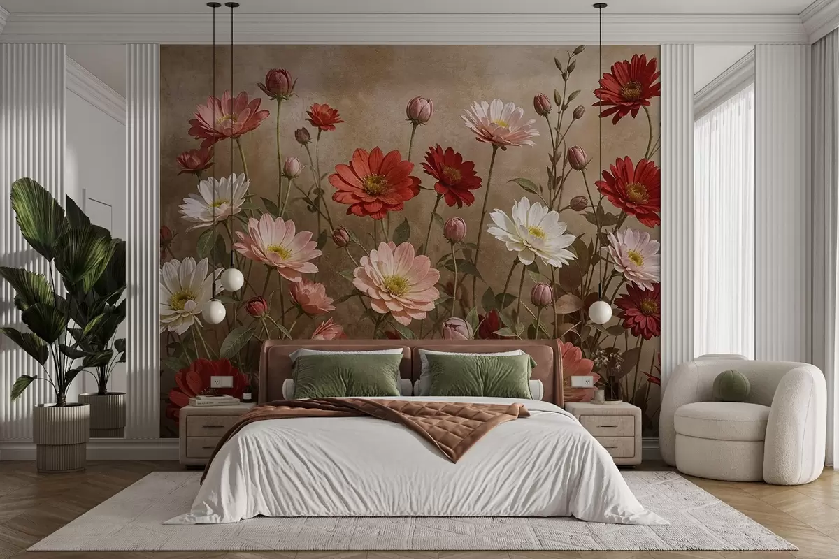 Fototapeten Ein Feld von bunten Gänseblümchen wie Blumen in verschiedenen Schattierungen von rosa, rot und weiß vor einem strukturierten Hintergrund Nr. w08462
