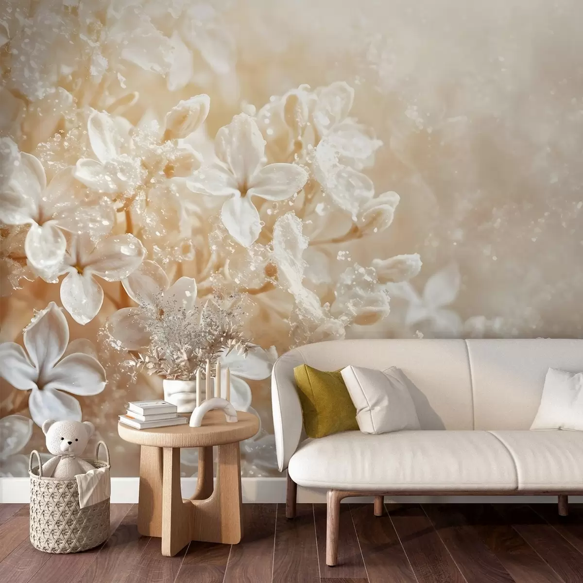 Fototapete Zarte weiße Fliederblüten mit weichem, gelbem unscharfem Hintergrund w08533