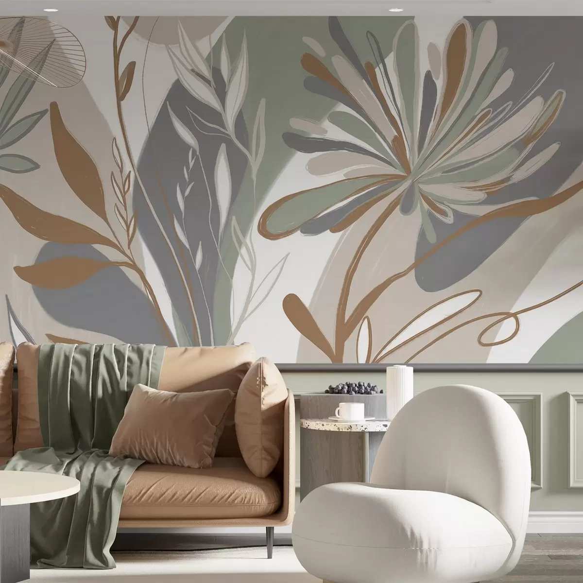 Fototapeten Abstrakter floraler, minimalistischer Druck mit stilisierten Blättern und Blütenblättern in Grün-, Grau- und Beigetönen Nr. w08536