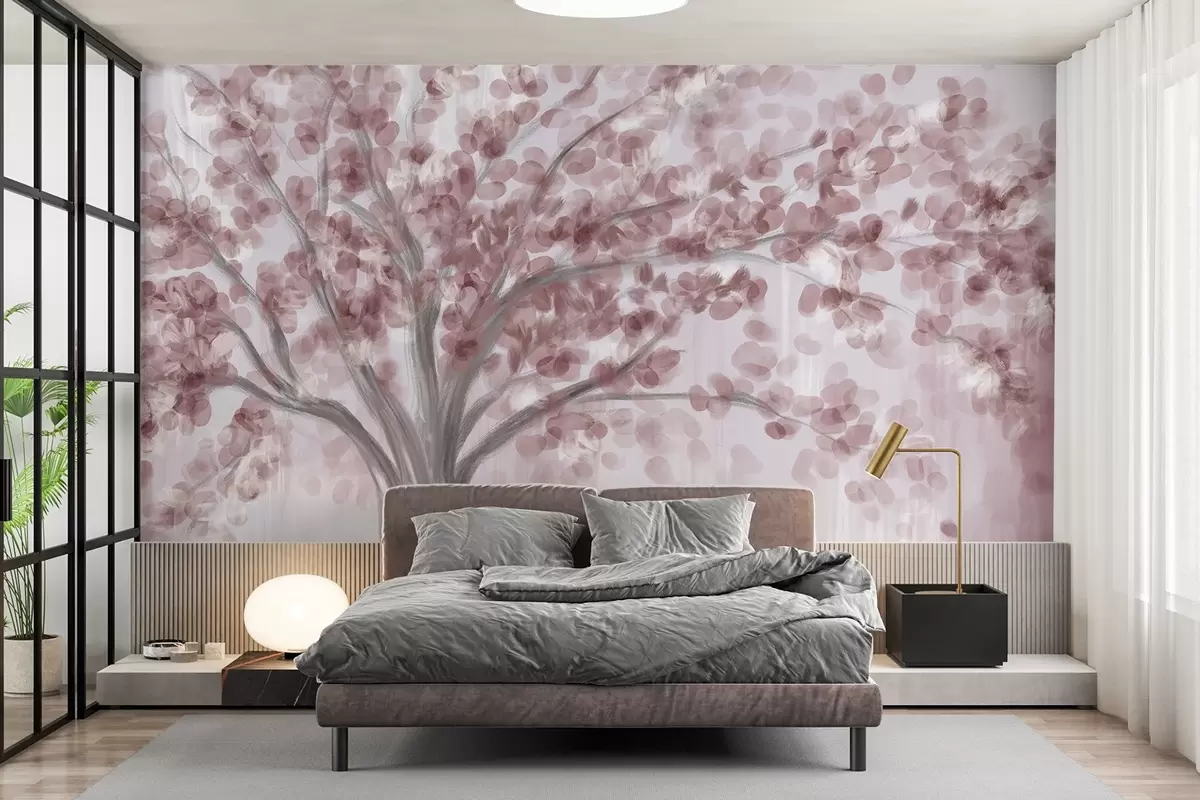 Fototapeten Ein großer Baum mit weichen, abstrakten Blättern in Rosa auf einem hellen, neutralen Hintergrund, der die Farbtöne des Baums hervorhebt Nr. w08669v2