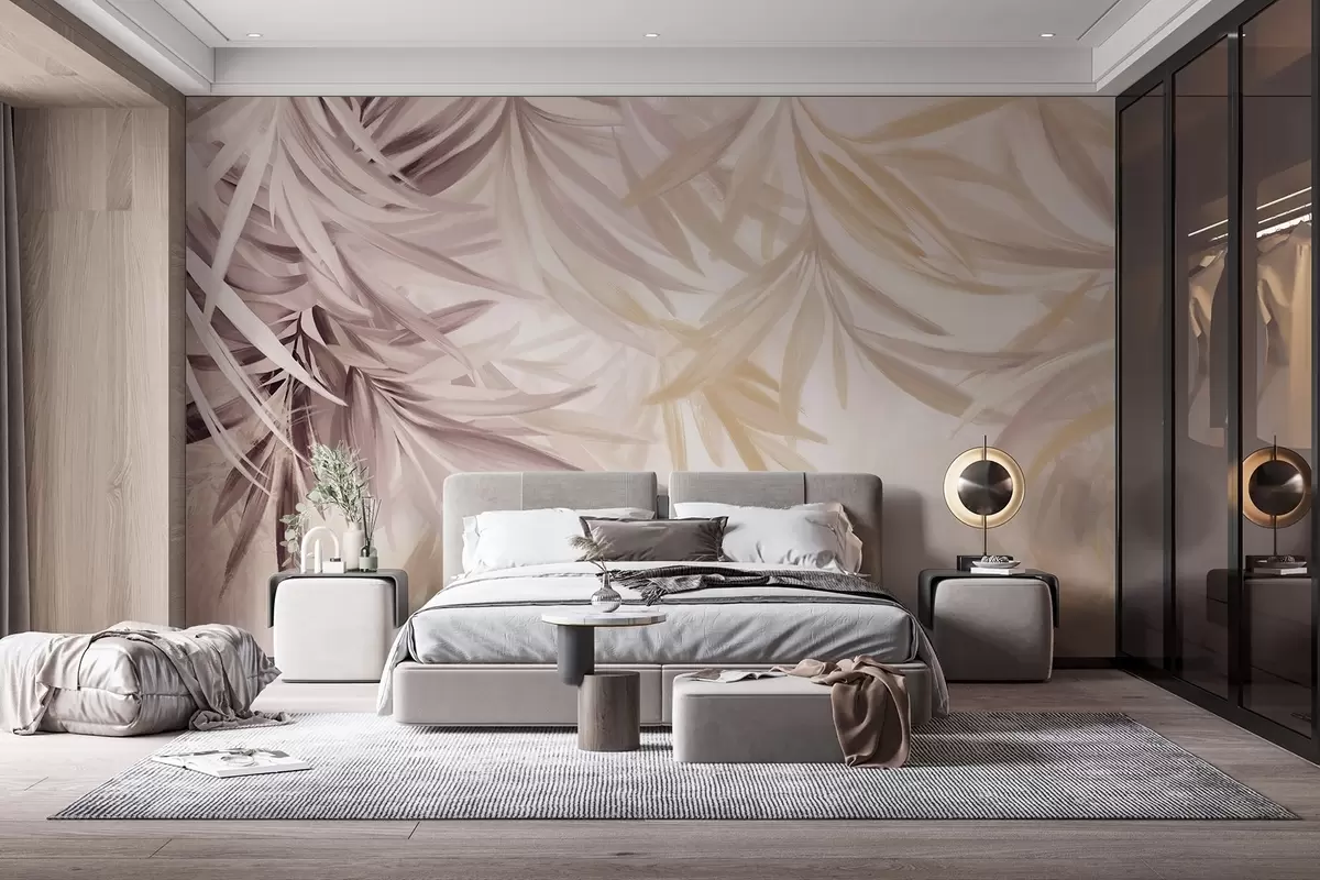 Fototapeten Weiche, fließende, helle tropische Blätter in Braun- und Orangetönen, die in einen hellen, neutralen Druck übergehen Nr. w08703v1