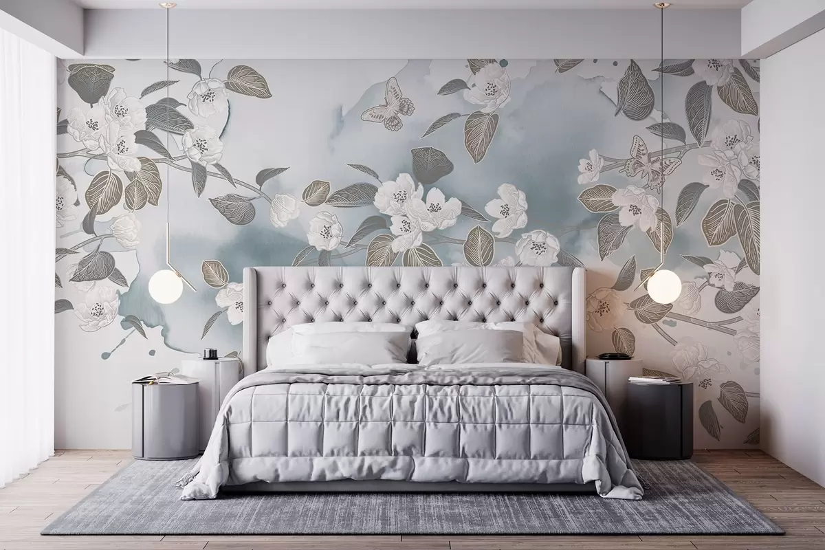 Fototapeten Kirschbaumblüte Zweig mit Blumen, Blätter, Schmetterlinge auf einem hellblauen Aquarell strukturierten Hintergrund Nr. w08831v1