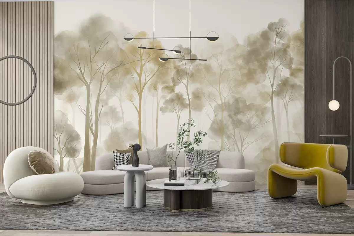 Fototapeten Wald im Aquarellstil mit hohen hellen Bäumen in Beige- und Gelbtönen, mit nebliger Atmosphäre Nr. w08870