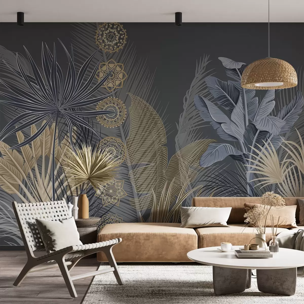 Fototapeten Tropische Blätter in Blau- und Brauntönen, Palmenblätter, Bananenblätter und Mandala-Ornamente, dunkler Hintergrund Nr. w08913