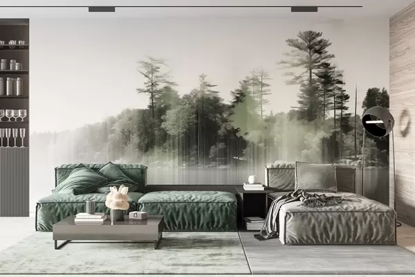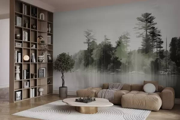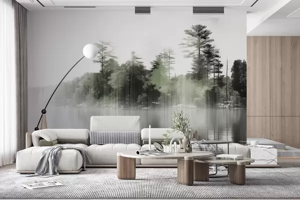 Fototapeten Abstrakter Minimalismus texturierte Landschaft mit einem See und Bäume Reflexionen im Wasser in grünen und weißen Farbtönen Nr. w09058