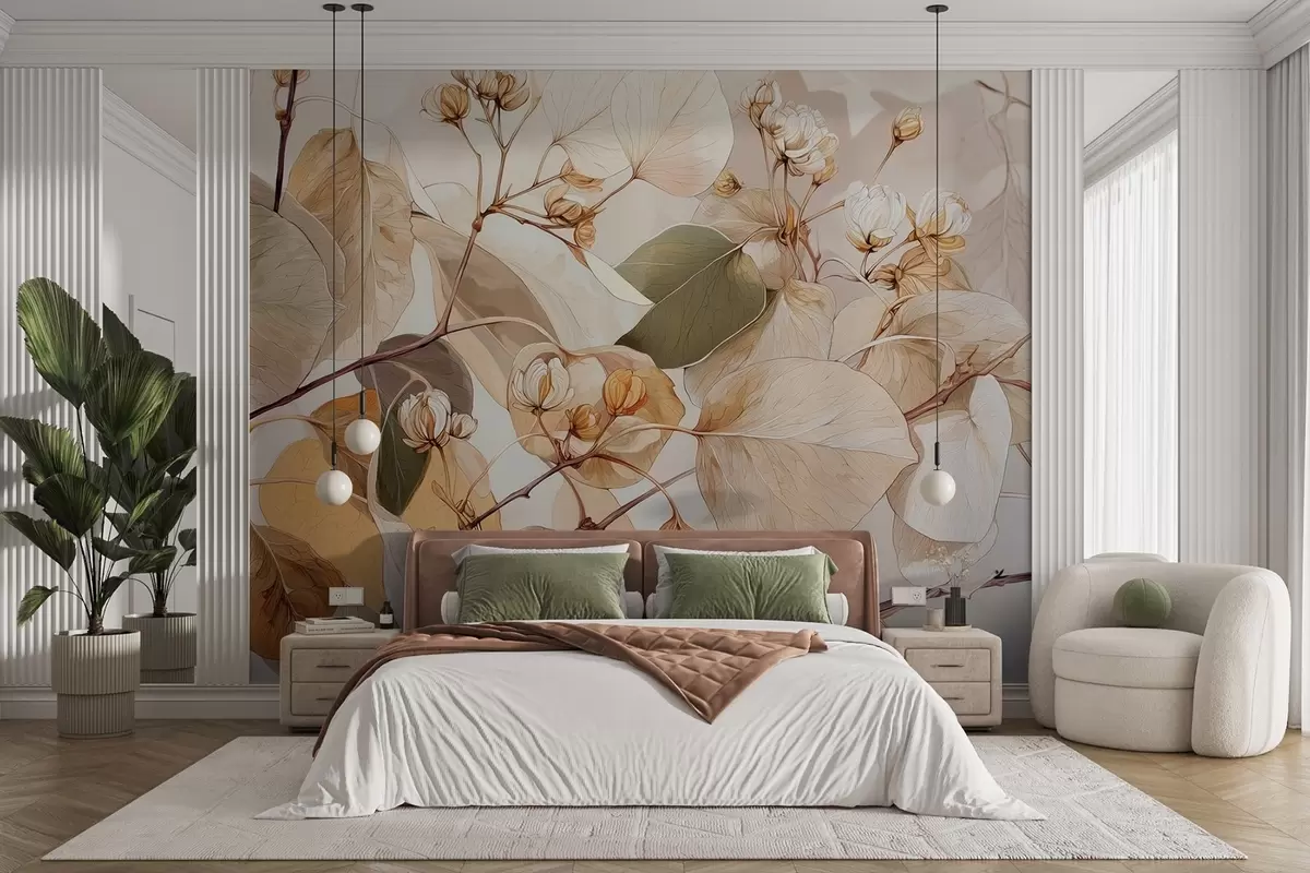 Fototapeten Zweige der Espe Blätter und Blumen in Ölgemälde Stil in Beigetönen Nr. w09082