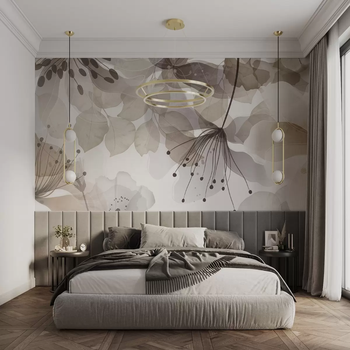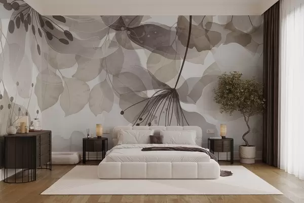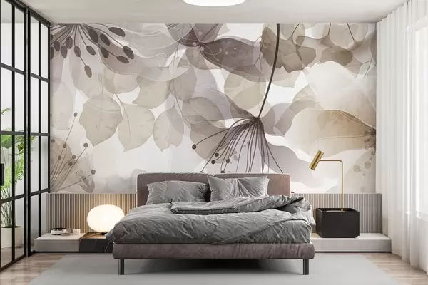 Fototapeten Blumen und Blätter in Beigetönen, durchscheinende Blütenblätter und Blätter, weicher Aquarelleffekt, zarte Linien, weißer Hintergrund Nr. w09107v1