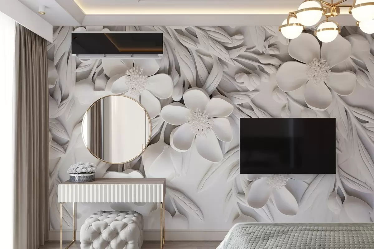 Fototapeten Weiße Blumen und Blätter in einem weißen Hintergrund, floral elegant, dekoratives Design, komplizierte Details Nr. w09113