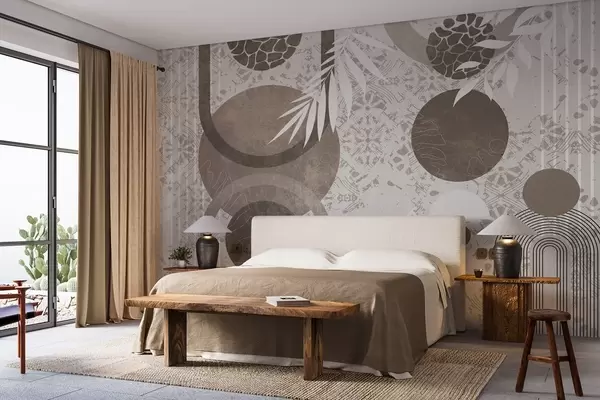 Fototapeten Abstrakte, geometrische Formen in Braun und Weiß, Kreise, Bögen und botanische Elemente, modernes und minimalistisches Design Nr. w09130