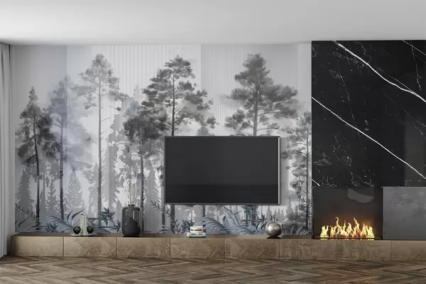 Fototapeten Ein dichter Wald mit hohen Kiefern, üppiges graues Laub, eine neblige Atmosphäre mit vertikalen Linien Texturen Nr. w09163v2