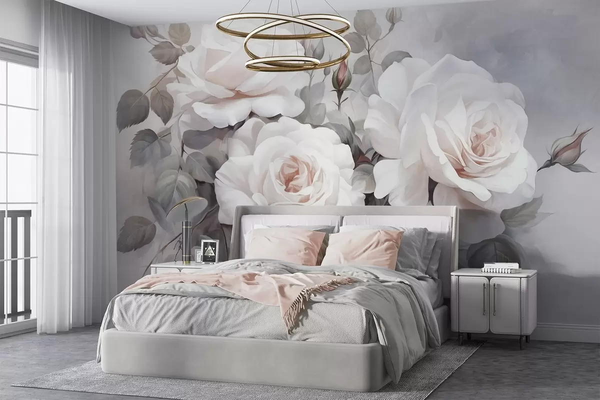 Fototapeten Strukturierte weiße Rosen mit Blättern und Stängeln, weiche gedämpfte Pastellfarben, eleganter Vintage-Stil, zarte Pinselstriche Nr. w09198