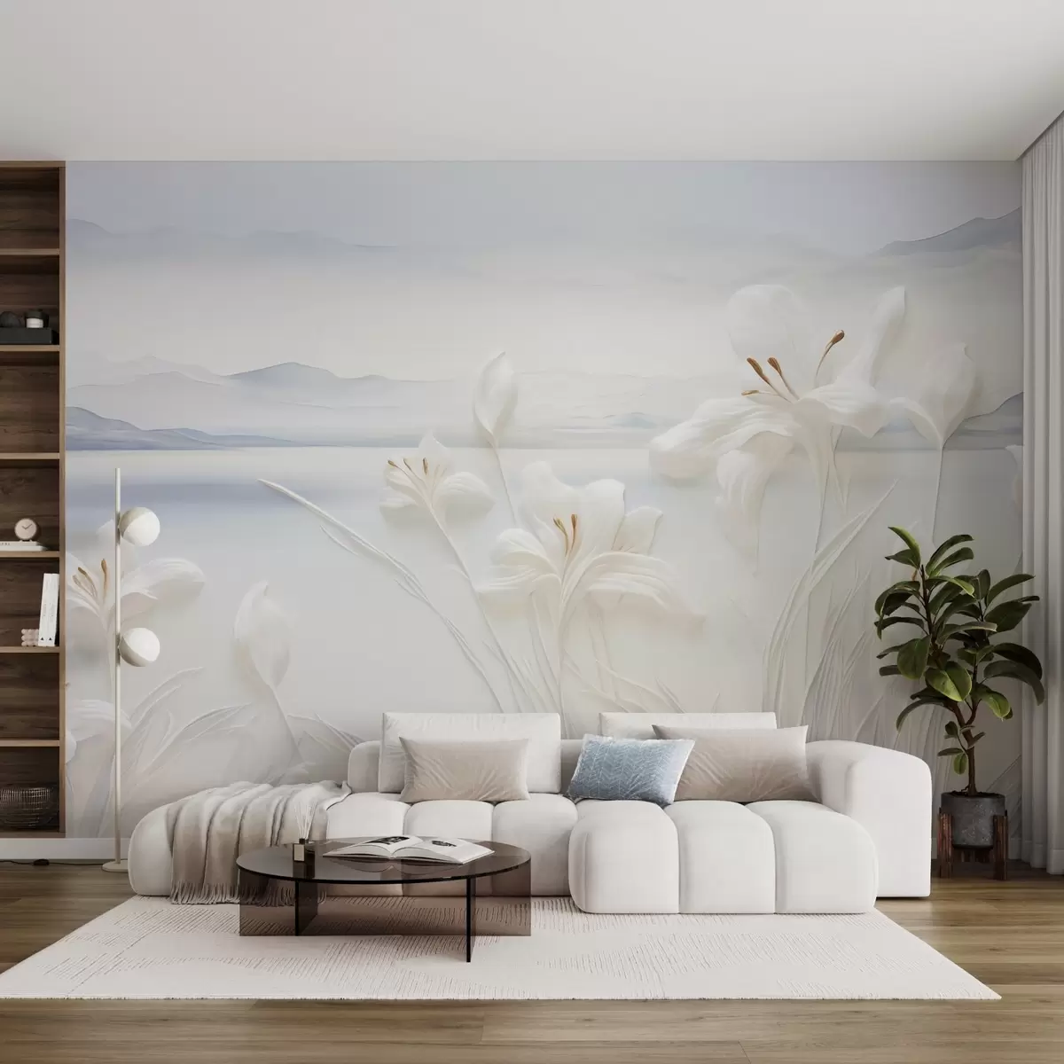 Fototapeten Weiße Lilien mit langen Stielen und Blättern, Berge und See im Hintergrund, minimalistische Landschaftskomposition Nr. w09206