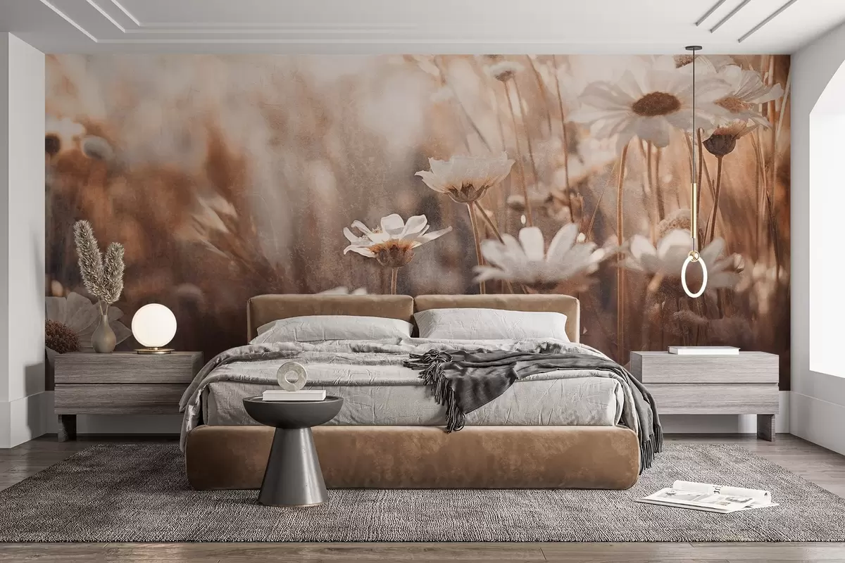 Fototapeten Strukturiertes Feld von weißen Gänseblümchen und Wildblumen in warmer Farbpalette mit verschwommenem Hintergrund Nr. w09214