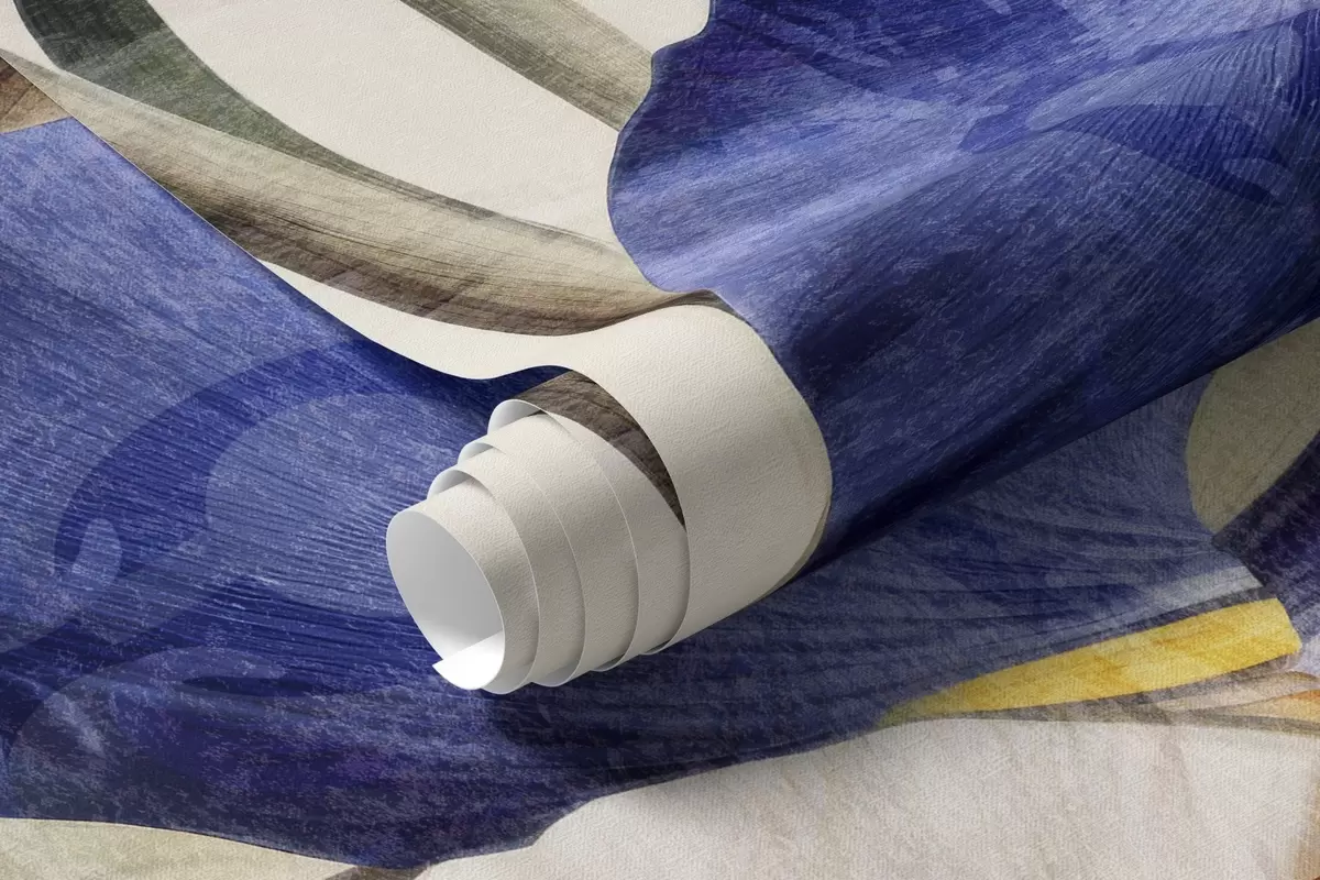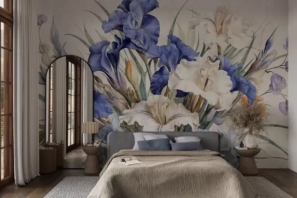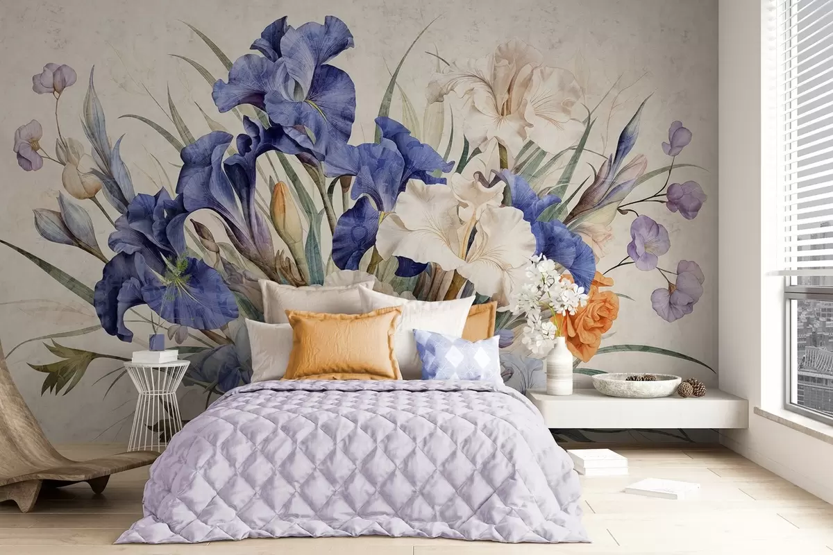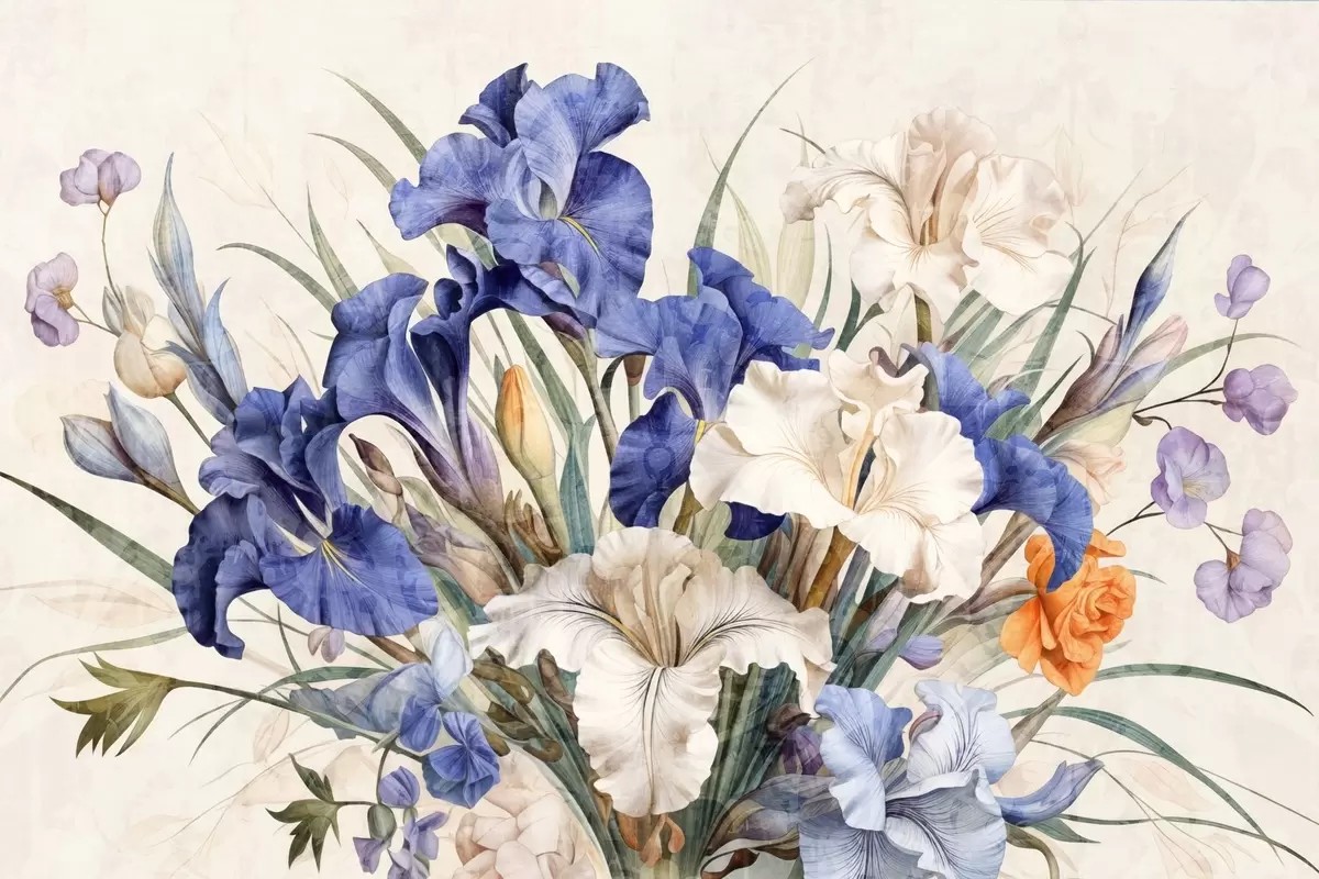 Fototapeten Vintage-strukturierter Strauß lilafarbener Schwertlilien, arrangiert mit grünen Blättern und Stängeln, vor einem weichen Hintergrund Nr. w09263