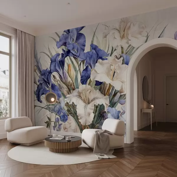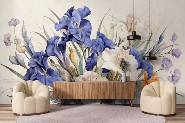 Fototapeten Vintage-strukturierter Strauß lilafarbener Schwertlilien, arrangiert mit grünen Blättern und Stängeln, vor einem weichen Hintergrund Nr. w09263