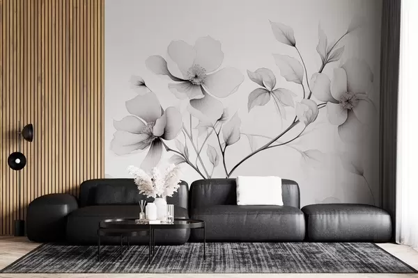 Fototapeten Schwarze und weiße Blumen mit eleganten Linien auf einem grauen Hintergrund Nr. w09271