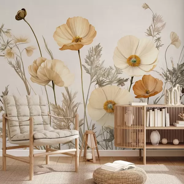 Fototapeten Orange und weiße Vintage strukturierte Mohnblumen mit dünnen Stielen und Blättern, hellbeige Hintergrund, Aquarell-Stil Nr. w09293