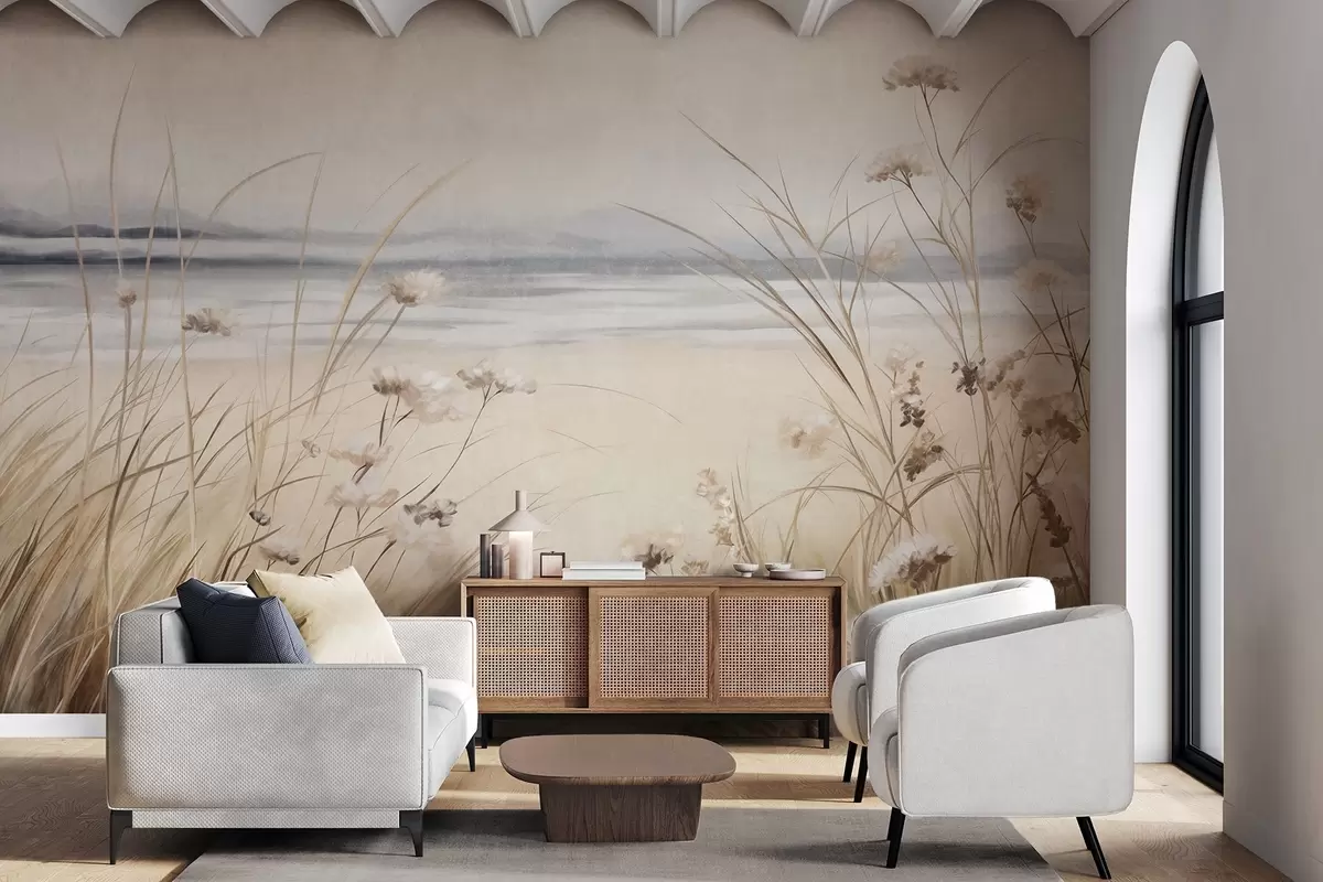 Fototapeten Ein Weizenfeld mit weißen Blumen im Vordergrund, ein Strand und das Meer im Hintergrund, neutrale, gedämpfte Pastellfarben Nr. w09298