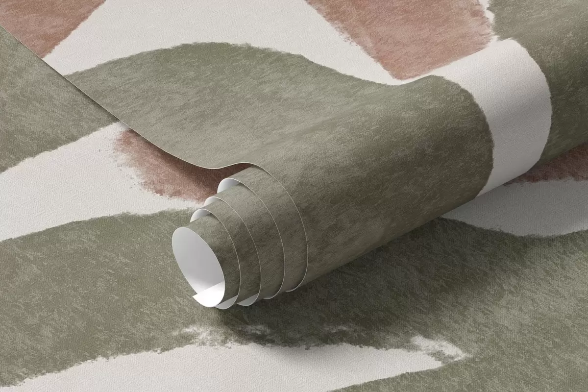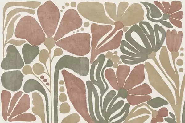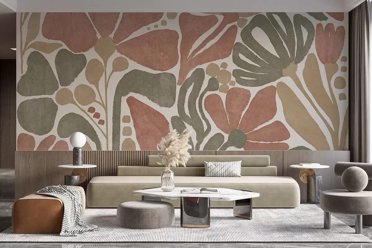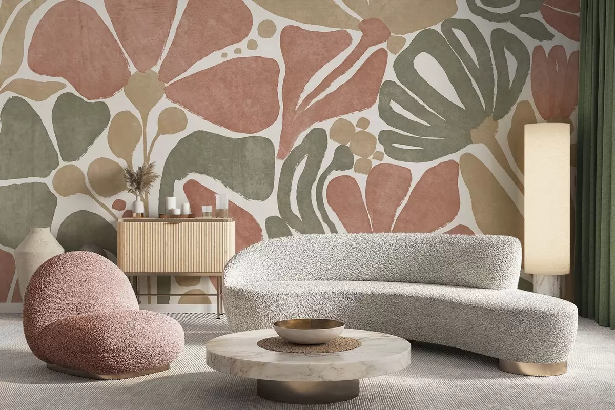 Fototapeten Abstrakte Blumen in Rot-, Grün- und Beigetönen, mit hellem Hintergrund, in einem flachen, stilisierten modernen minimalistischen Design Nr. w09315