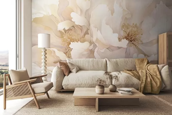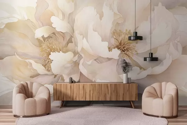 Fototapeten Blumen mit Pfingstrosenstruktur und zarten Blütenblättern in cremefarbenen Pfirsich- und hellrosa Tönen mit einer weichen, aquarellartigen Textur Nr. w09321