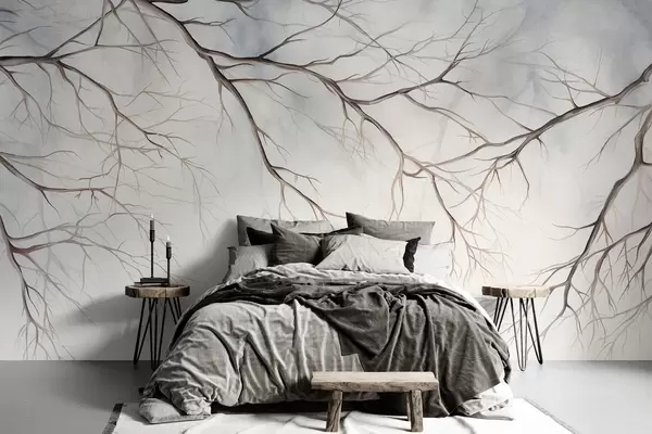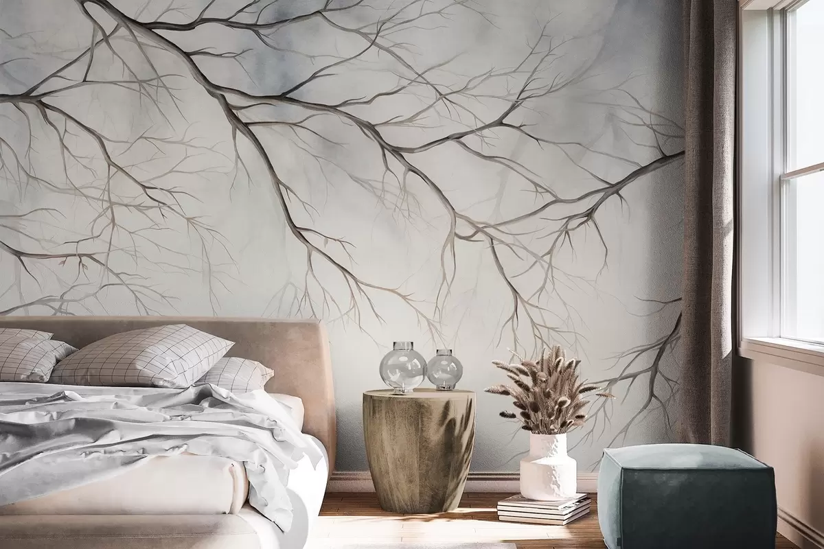 Fototapeten Baumzweige mit einem Aquarell strukturierte Wirkung , komplizierte Details, weiche Farbpalette, vor einem hellen Hintergrund Nr. w09337