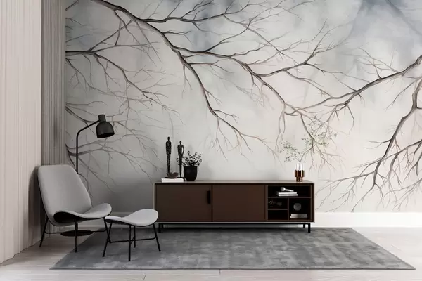 Fototapeten Baumzweige mit einem Aquarell strukturierte Wirkung , komplizierte Details, weiche Farbpalette, vor einem hellen Hintergrund Nr. w09337