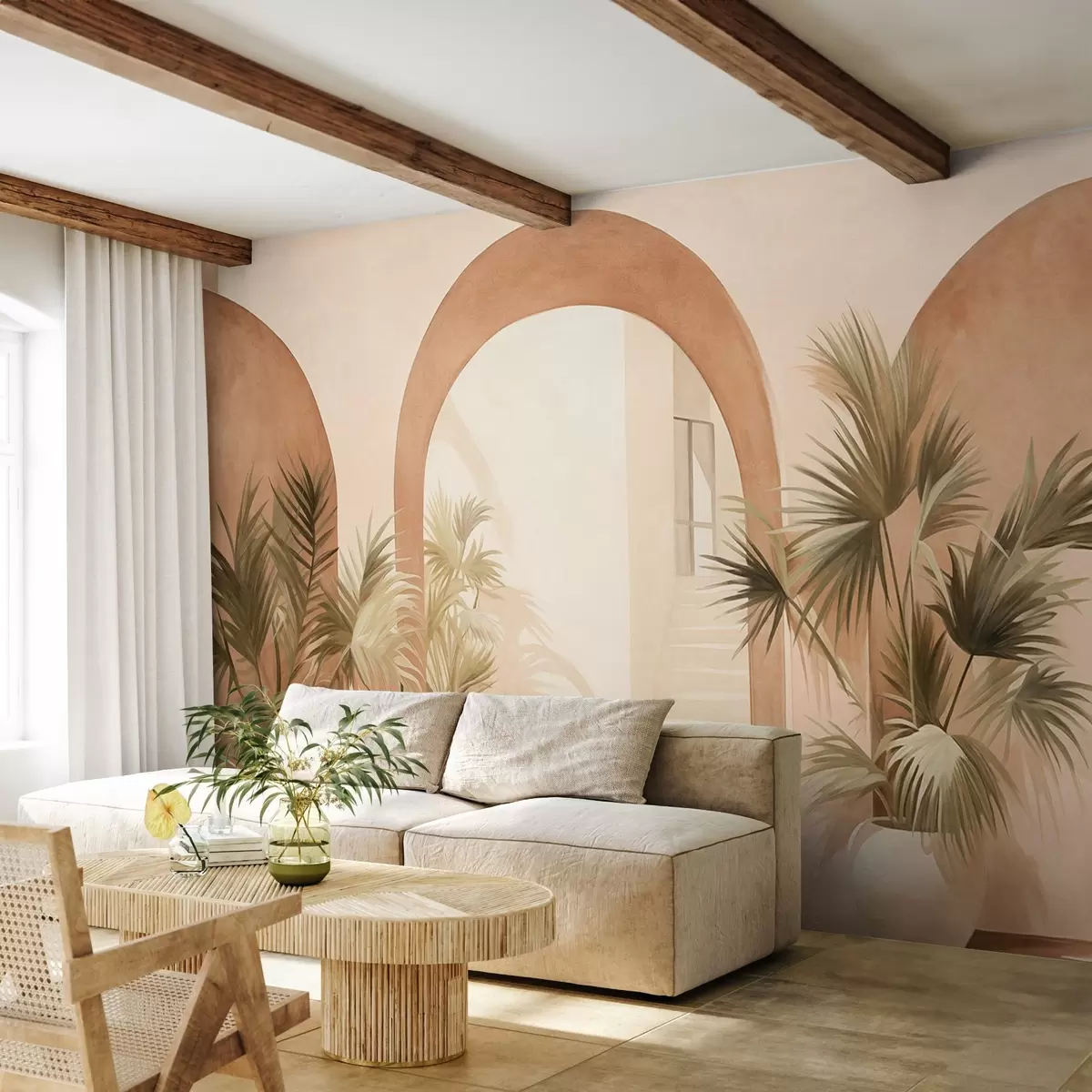 Fototapeten Strukturierte Bögen mit Topfpflanzen, hellbeige Farbpalette, minimalistisches Design, Treppenhaus im Hintergrund Nr. w09339