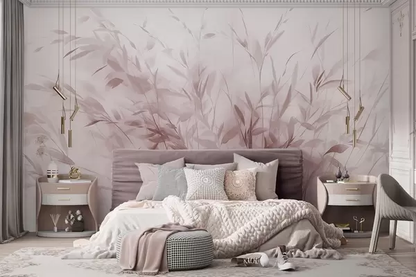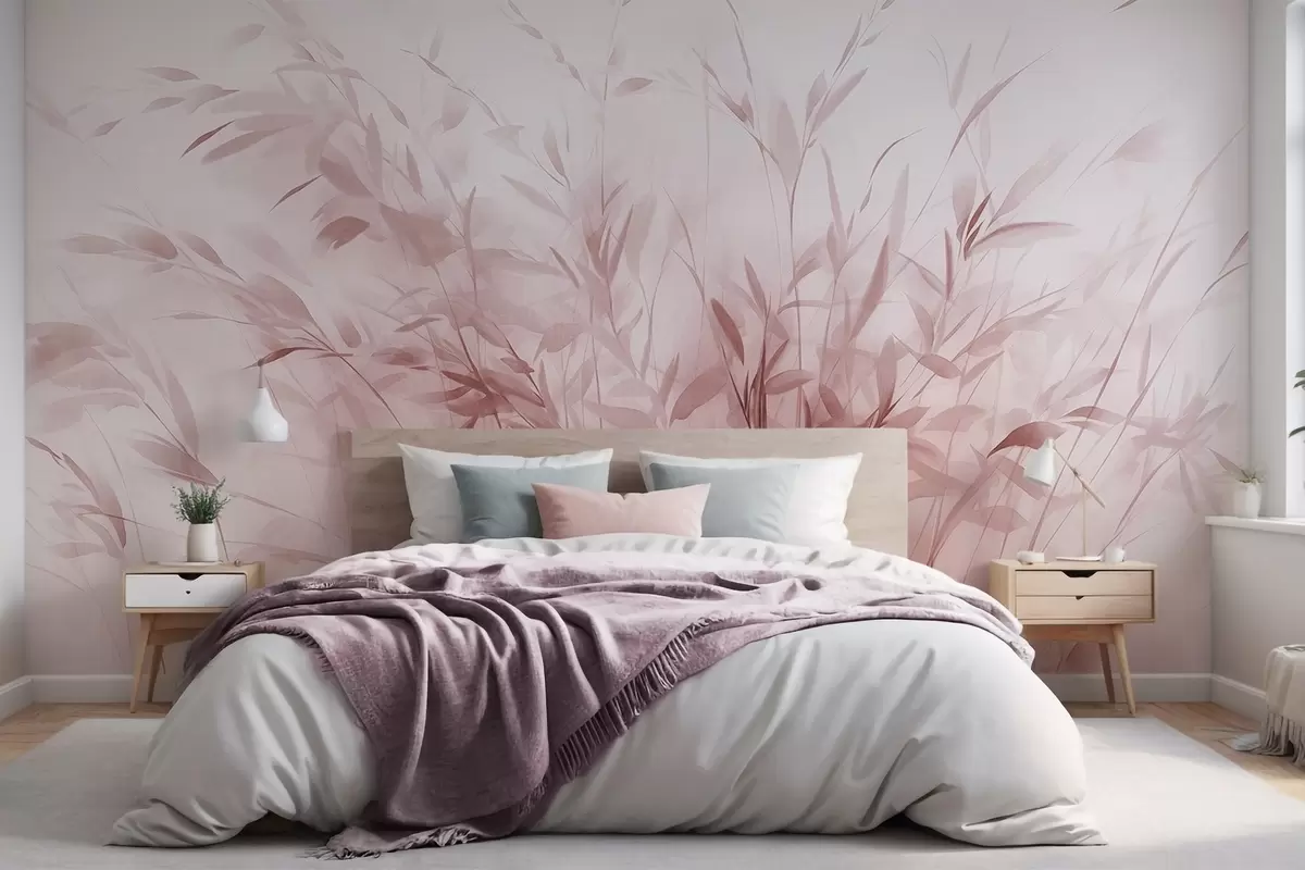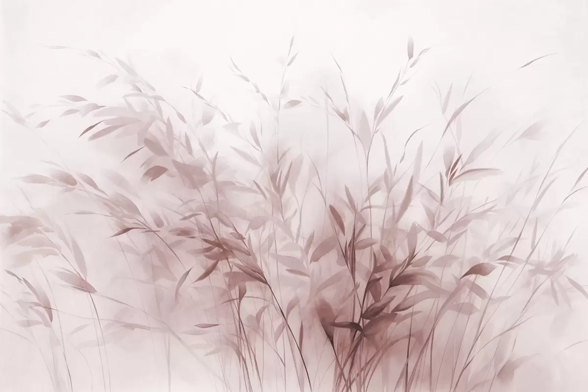 Fototapeten Gras und Unkraut mit dünnen Blättern und Stängeln, hellrosa Farben, weiche und zarte Pinselstriche, minimalistischer Druck Nr. w09342v2