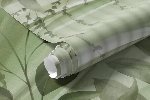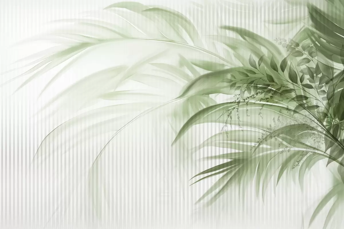 Fototapeten Tropische grüne Palmenblätter vor einem weiß gestreiften Hintergrund, weiche Beleuchtung, zarte Pinselstriche, organische Formen Nr. w09343